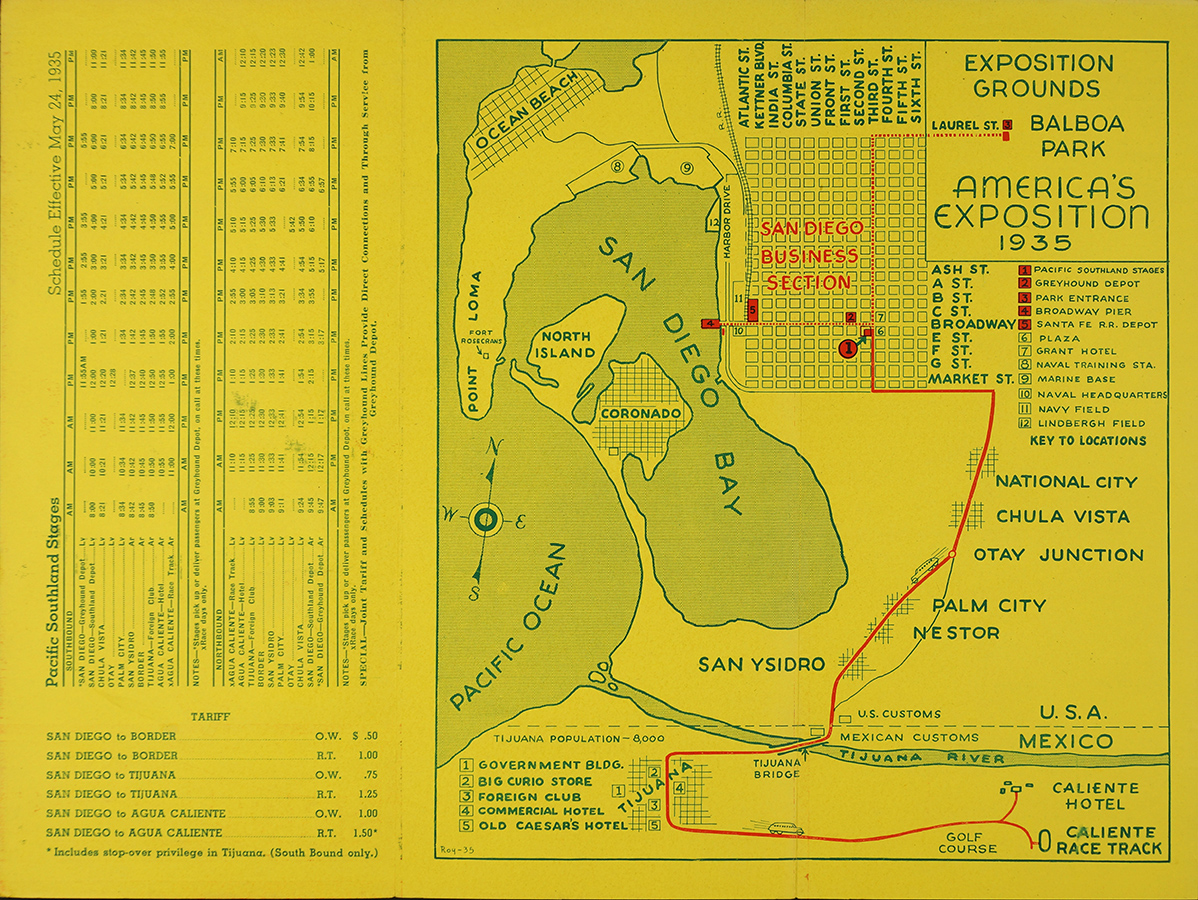Description: single-page multifold ad promoting "See Romantic Mexico" via Pacific Southland Stages, Inc.; side 2 includes map showing Caliente Hotel & Race Track