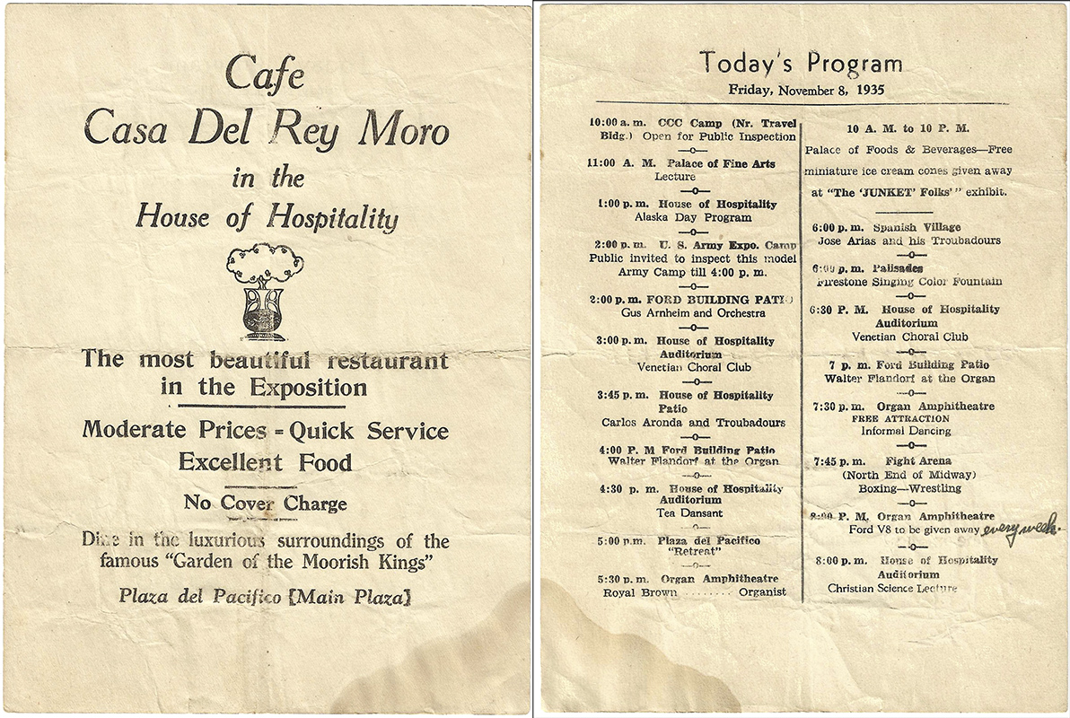 Description: "Today's Program" of music and events at the exposition; Casa del Rey Moro ad on reverse side