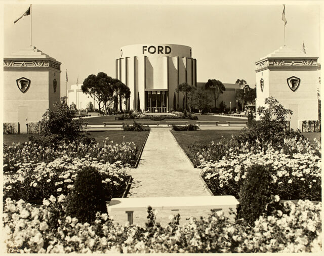 Description: view of Pan American Plaza looking south; two speaker kiosks with Firestone logo; Ford building in distance