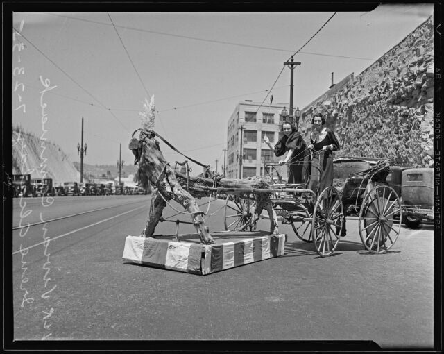 Description: Text from newspaper caption: Centerville's famous tree horse takes Miss Vivian Cammack, left, and Miss Irene Alcalay for a ride. The log is from a pepper tree and is being taken to the California Pacific International Exposition to herald the American Legion State convention to be held at Fresno August 10 to 15. Text from negative sleeve: 1289 - Vivian Cammack Irene Alcalay wooden Horse 7-23-35 [stamped:] Jul 31 1935