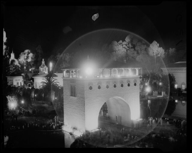Description: Night view of the Arco del Porvenir (Arch of the Future) with Exposition visitors strolling in the Plaza del Pacifico