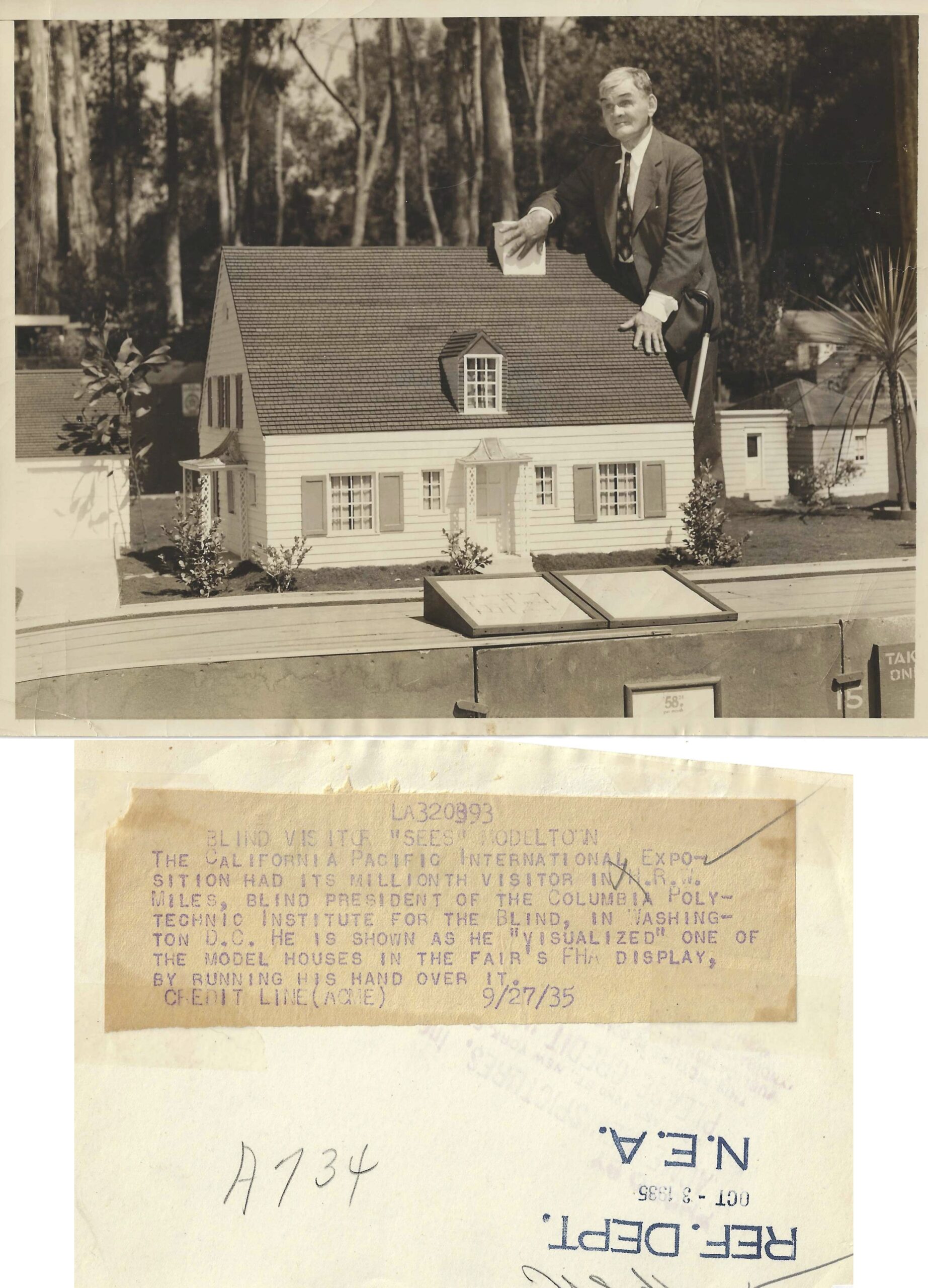 Description: H.R.W. Miles, blind president ot the Columbia Polytechnic Institute for the blind in Washington DC, feeling a model home. Miles was also the one-millionth visitor to the exposition.